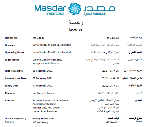 CerTa Veritas Middle-East Ltd was granted its company license on February 8-th, 2021. The new office is located in Masdar City, Abu Dhabi and will be managed by Local Manager Jacco Jansen. Jacco has been active in the Middle East power industry for many years now. In the past he was the driving force behind the (former) KEMA Middle-East office in Dubai and has worked with CerTa Veritas team (at the time part of KEMA) for many years in the region. Recently he joined forces again with his ex-colleagues in recognition of the unique package of services and experience that CerTa Veritas has to offer to its customers. Jacco can be reached by means of the contact details listed below and he will be delighted to assist you further with your specific power generation performance matters.